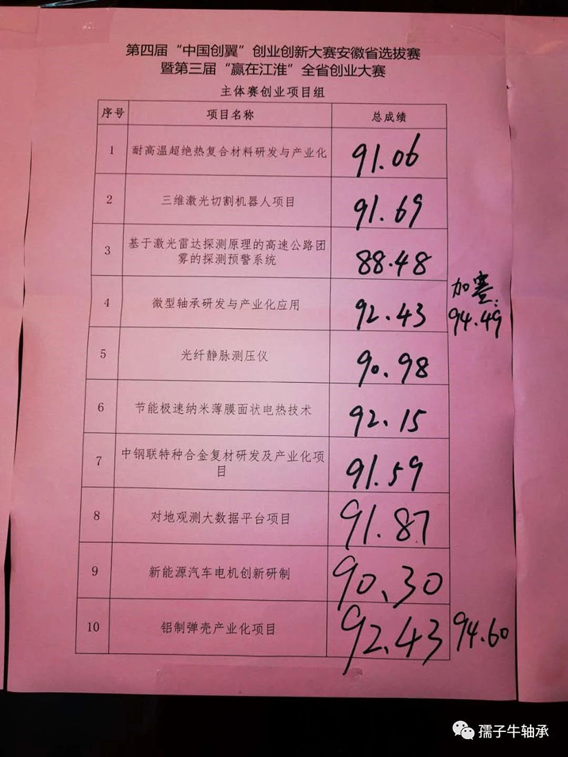 2020年9月12日—14日,第三屆“贏在江淮”全省創(chuàng)業(yè)大賽省級決賽在合肥舉行,由省人社廳、發(fā)改委、教育廳、科技廳、經信廳等單位主辦。省勞動就業(yè)服務局、省就業(yè)促進會承辦。經安慶市人社局及安慶市公共就業(yè)創(chuàng)業(yè)服務中心的精心安排,孺子牛的“微型軸承研發(fā)與產業(yè)化應用”項目,從潛山市級初賽、決賽,安慶市級選拔賽、決賽,安徽省級復賽一路闖關,進入省決賽主體賽創(chuàng)業(yè)項目組,經過商業(yè)計劃書的呈現(xiàn)與現(xiàn)場的激情路演,以92.43分值并列第一名,但由于本場賽事只設一個一等獎,出現(xiàn)了兩個“第一名”的爭奪一個"一等獎"的情況,根據賽事規(guī)則臨時進行了3分鐘加賽,加賽在異常緊張的氛圍下進行問答,最終本項目以94.49的分值位居第二名。